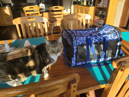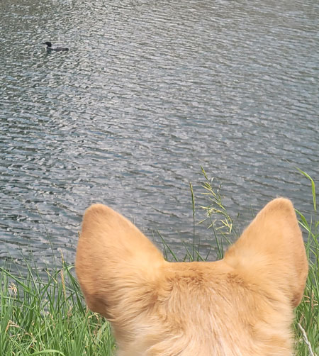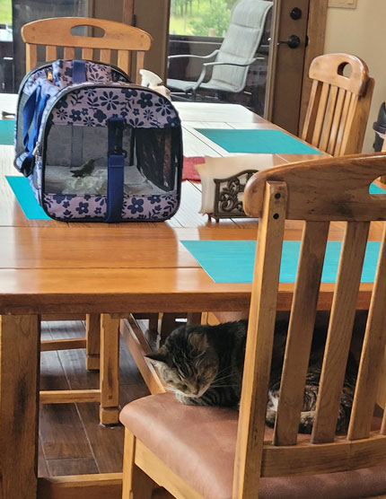 | The Loons are so curious, here Buddy & a loon check each other out. | Eric has Millie all rigged up in a cat carrier with a feeding tube and constant care. |