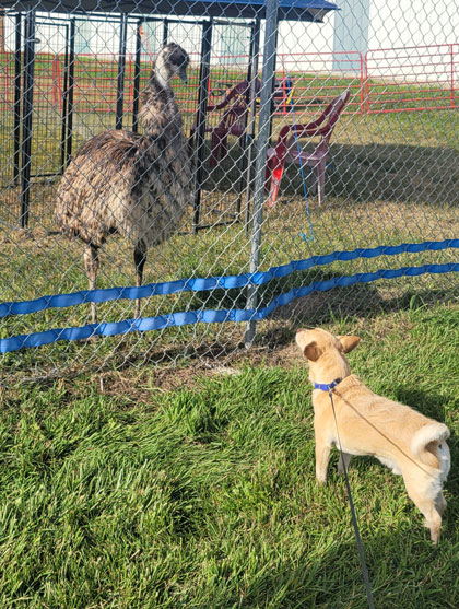 | Fair time! Here Buddy checks out the Emu, who wanted to peck Buddy really bad. | |
