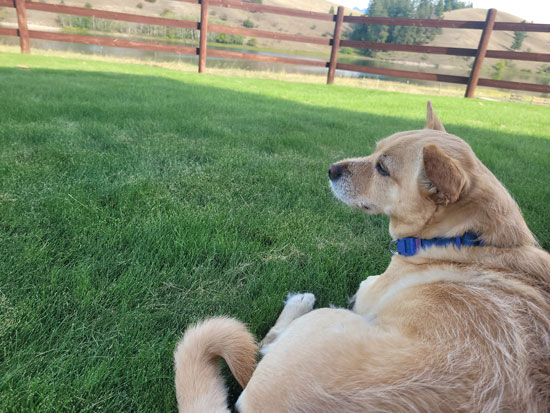As much as he enjoys roasting in the front porch sun, he also enjoys lounging in the shady grass. |
