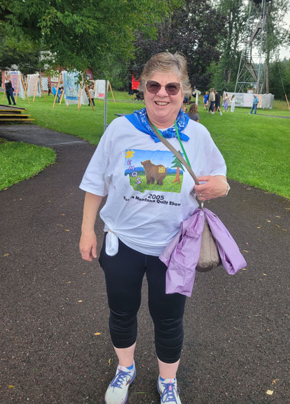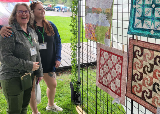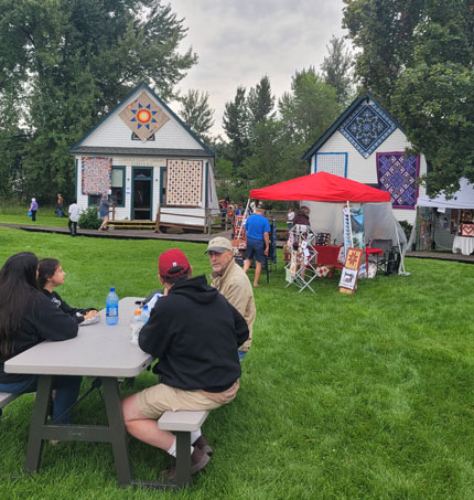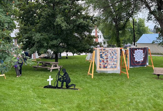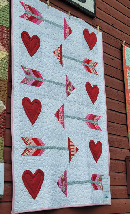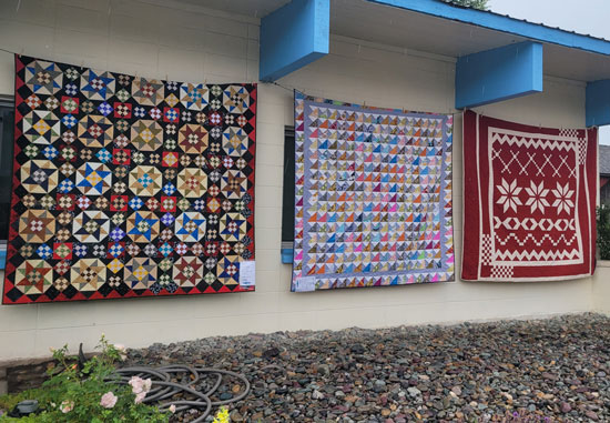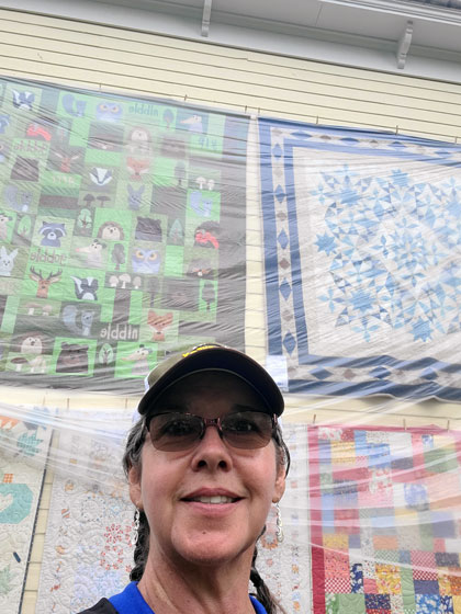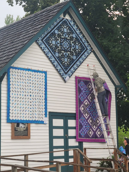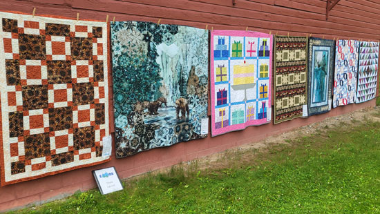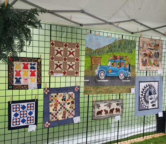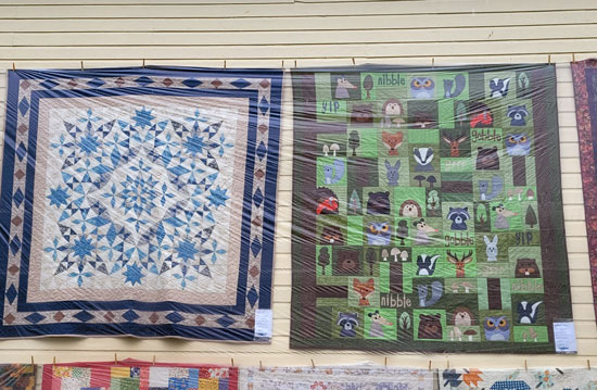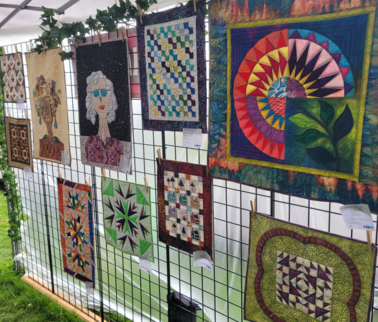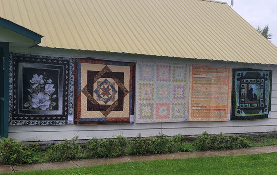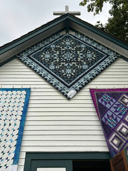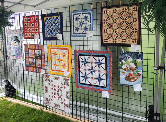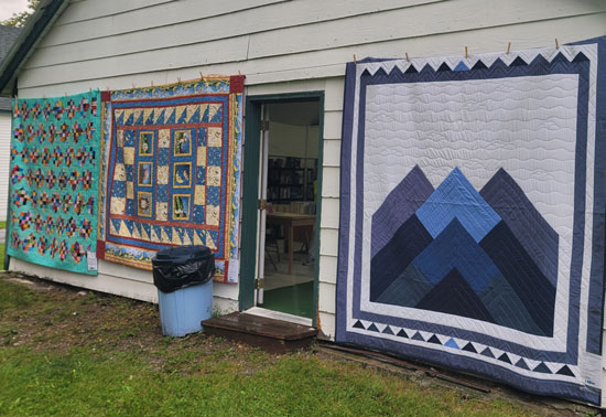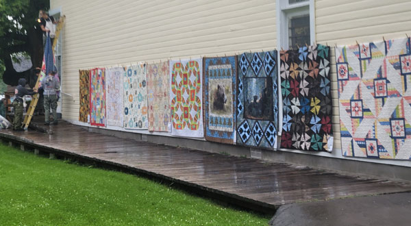 | The upper right quilt is one of mine, "Interlocked". There were a lot of pretty ones hanging here. | EMQS takes place the first Saturday in August, every year. Perhaps you would join me in praying that future years do not have rain! |