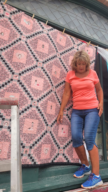 | This pink quilt fell down and one of the quilters helped me put it back up. | |