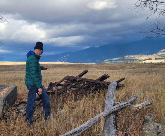 Eric demonstrating his unique way of wearing a sock cap, and an old manure spreader. |