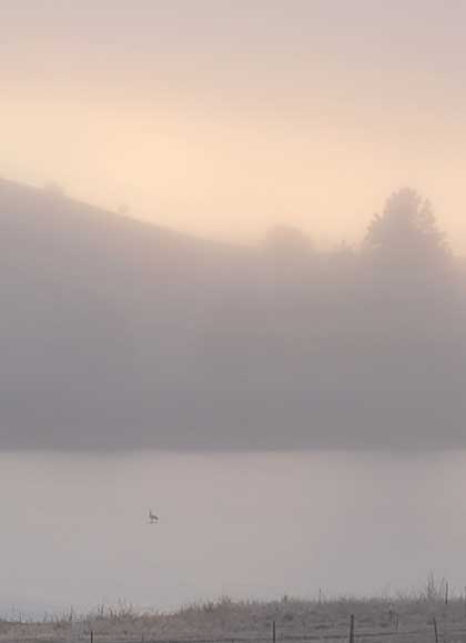 A lone goose stands on the ice in the midst of an inversion. |