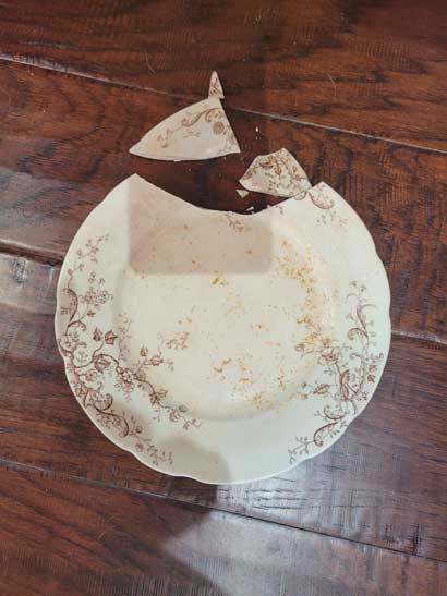 This was a fancy piece of China from England that had served as Buddy's fooddish for about 8 years. As I was picking it up, my phone fell out of my pocketand ruined it. The end of an era! Now he uses a plain plate like a peasant dog. |
