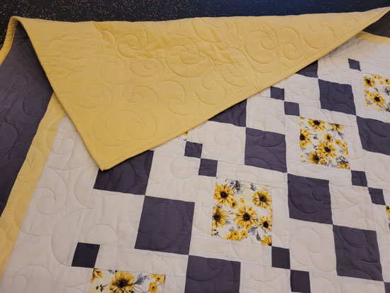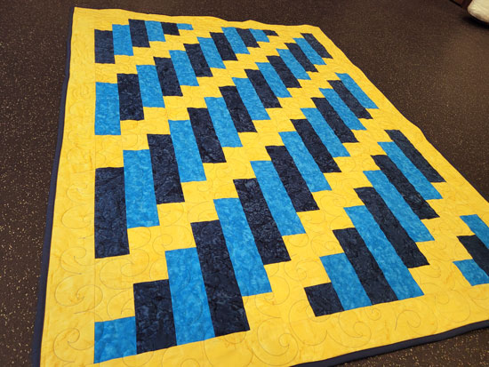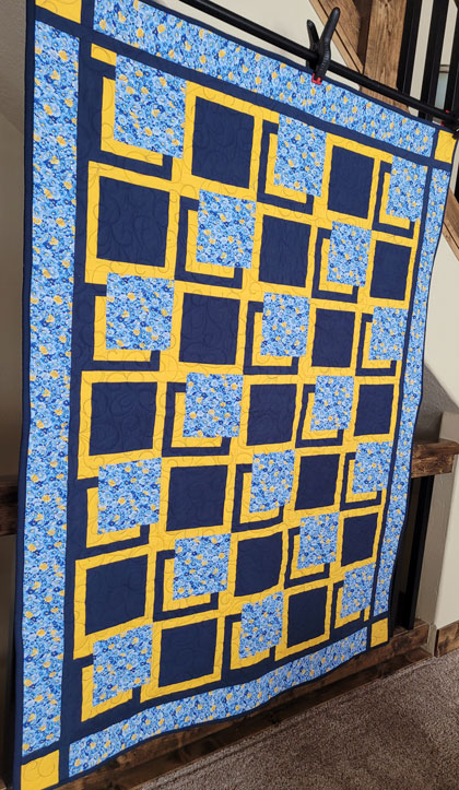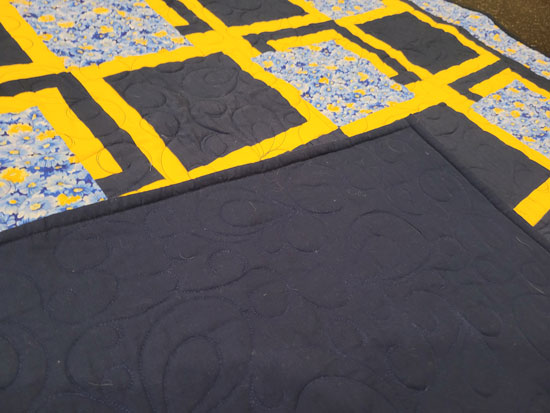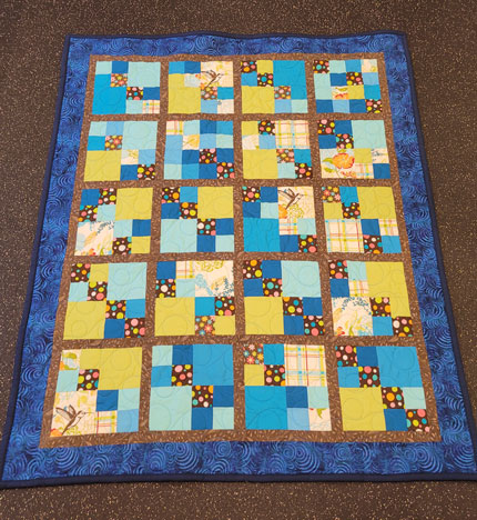 disaster in North Carolina. She made friends with two ladies there and wanted to supply them with quilts. She mentioned this to my Mom, who immediately commissioned me to make two, cheerful, blue & yellow lap quilts. This is the first of the two. Mom wouldn't let me donate them to her, she insisted on
