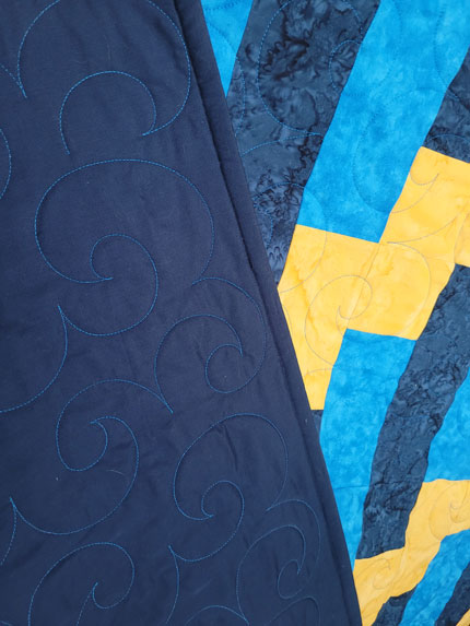 | Creamy tan backing. | I worked hard on the quilting, the rocks looked