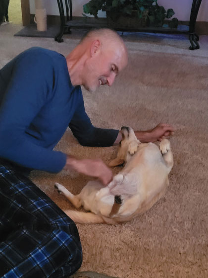 | Buddy has trained Eric that when he flips over like this, Eric must drop down and give him belly rubs immediately. Eric learned his trick pretty well! |