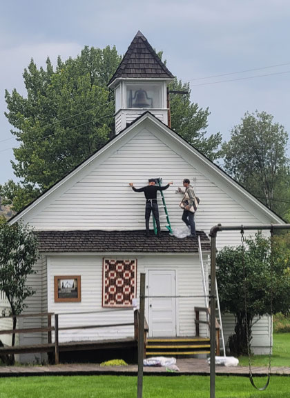 | Eric trying to reach everything while Michael tries to keep the ladder from sliding off the wet roof. | The other peaks are hung with the ladders on the ground, so a little