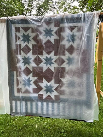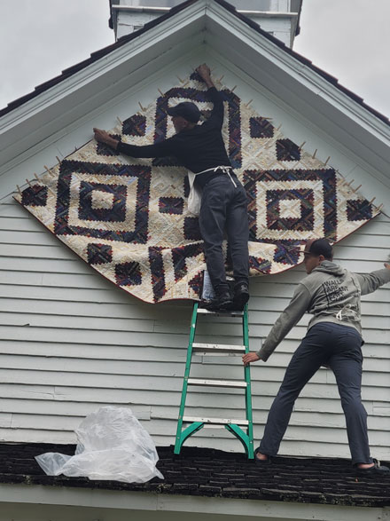 | The boys, almost finished with the fronts of the buildings. | The lady told us the wrong dimensions of that quilt, so it didn't fit the spot. |