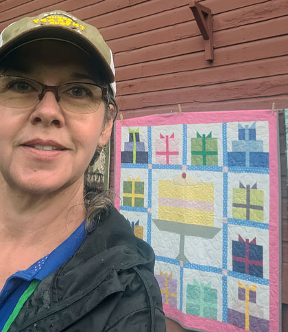 | Me & my Happy Birthday quilt, the second one of these I've made. The fabric is shiny. | |
