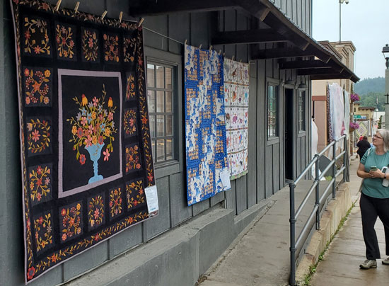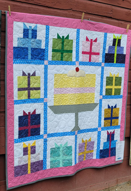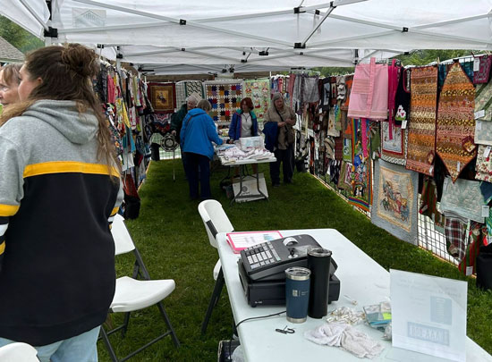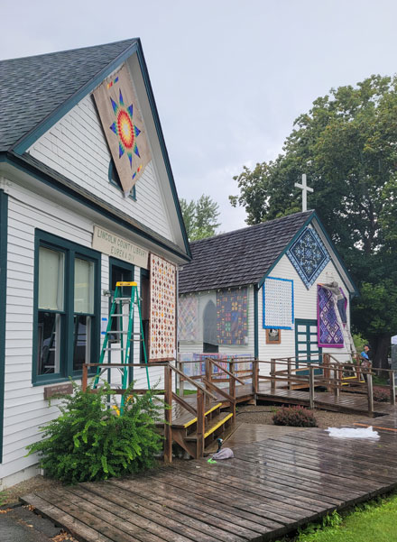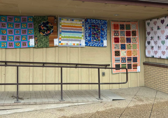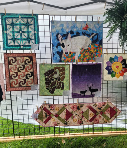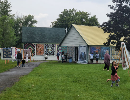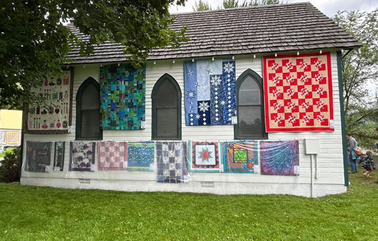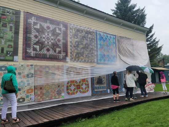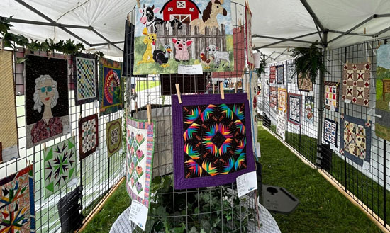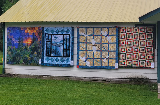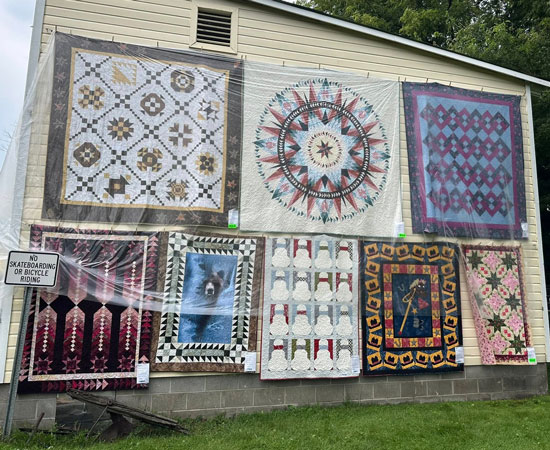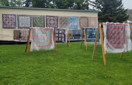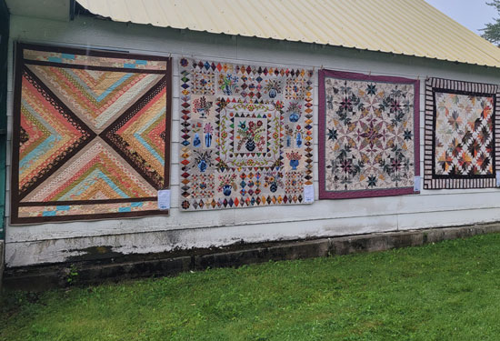 | The upper right quilt is one of mine, "Interlocked". There were a lot of pretty ones hanging here. | EMQS takes place the first Saturday in August, every year. Perhaps you would join me in praying that future years do not have rain! |