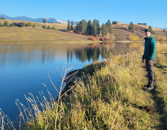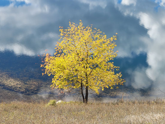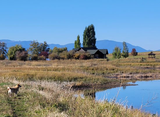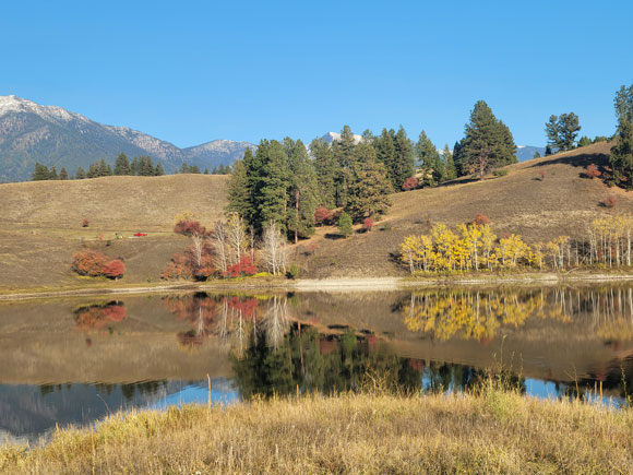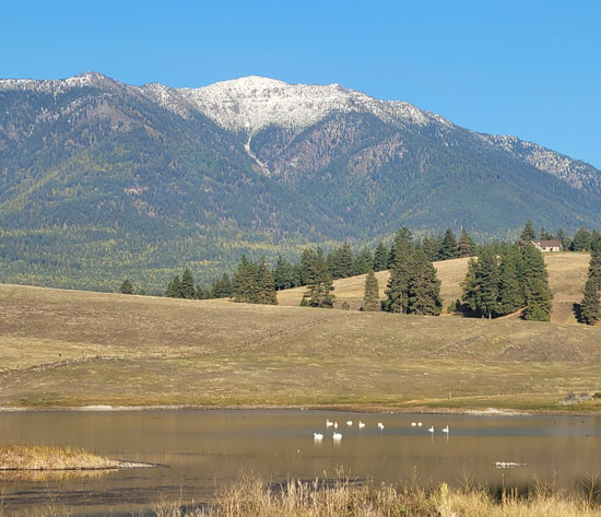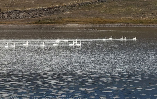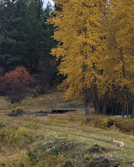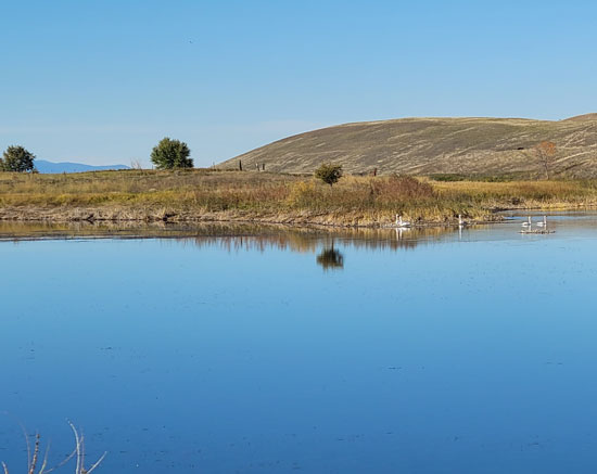 | Some of the many swans that hang out at the north end of the lake. | Buddy, having deep thoughts and contemplating the fall beauty. |