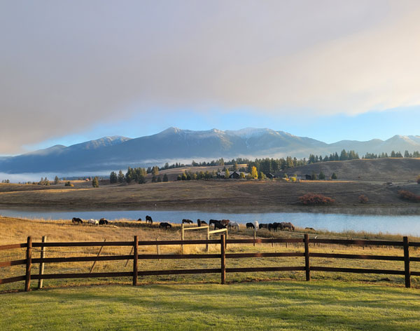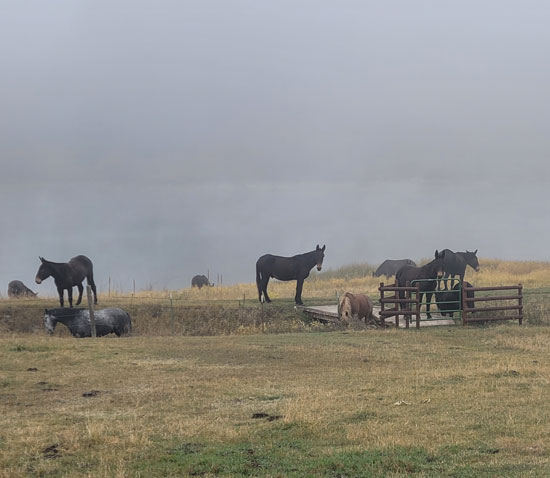 | The mules grazing while the inversion stalks us. | Now the inversion is upon us, boo!! When Josh built me that bridge, he
