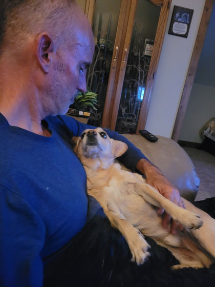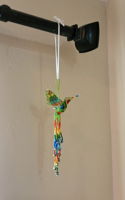 | Mom, snuggling her 13-year old "baby". | Mom sent Eric this beaded hummingbird in honor of Millie, the bird he tried to rescue this summer. |
