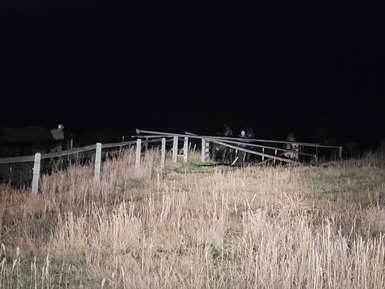 night. Dan had just gotten home from a 4-day hunting trip and was NOT pleased to be out chasing mules in the dark. Here Eric, Tracie, and Dan fix the problem while I sit in the car to cheer them on. |
