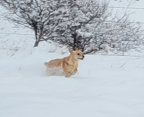 | I love a blue sky day after a snow. This was more like a "blue sky hour", but it counts! | He gets the zoomies in deep snow sometimes. |