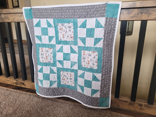 the designer suggested this baby quilt pattern that could be made from the leftovers from that quilt. |