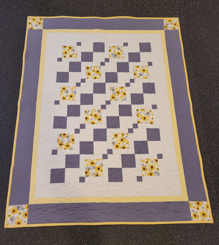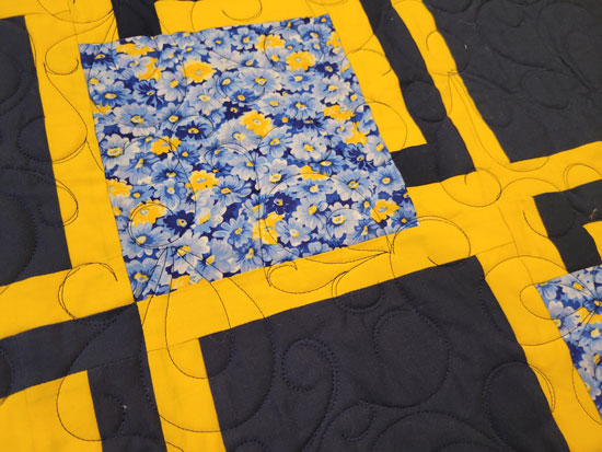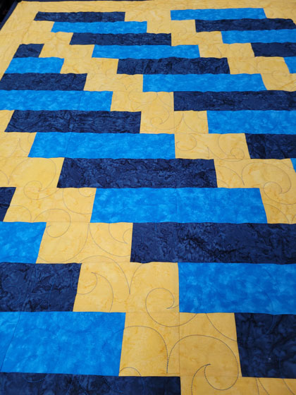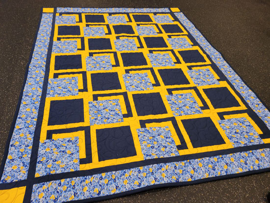 disaster in North Carolina. She made friends with two ladies there and wanted to supply them with quilts. She mentioned this to my Mom, who immediately commissioned me to make two, cheerful, blue & yellow lap quilts. This is the first of the two. Mom wouldn't let me donate them to her, she insisted on