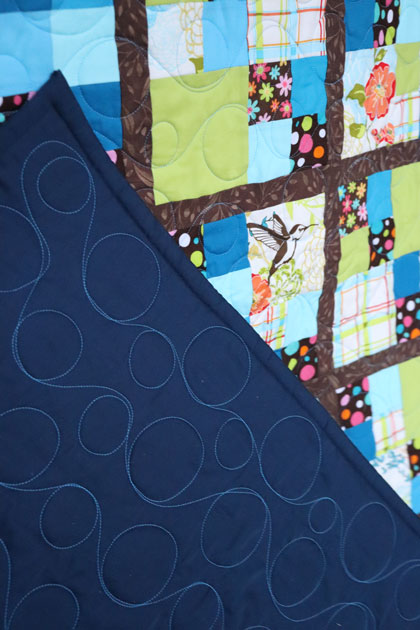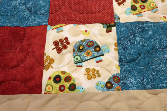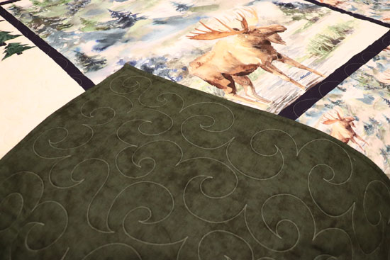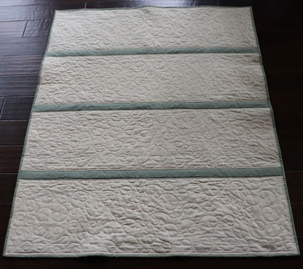 This was a unique kind of quilt kit I purchased - it didn't include the panel, just the green border part. It wasn't quite large enough for the panel I wanted to use it with, so I put those gaps in there and decided it looked just fine like that. |