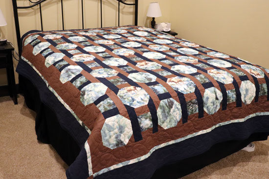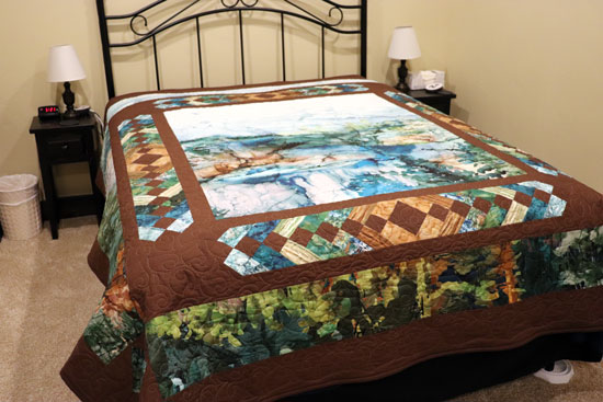 Eric and I made a date of a trip to the Bigfork Quilt Show one year. While there, I bought this quilt kit at the boutique. It sewed up so beautifully. The fabric was just gorgeous. |