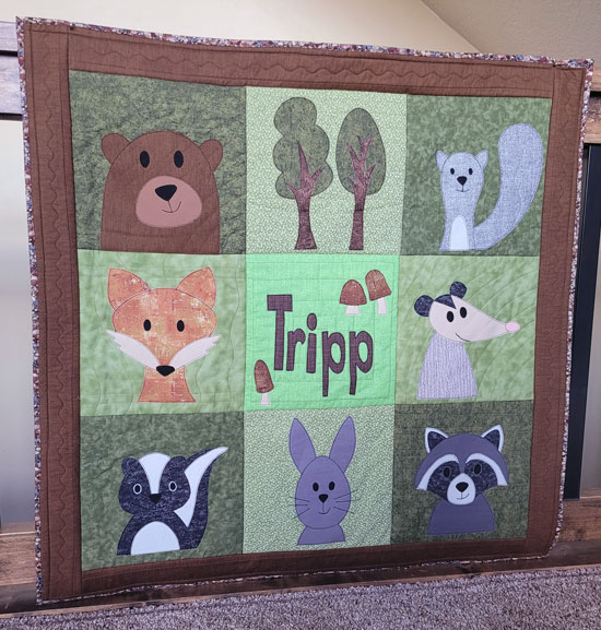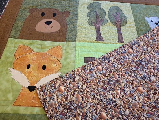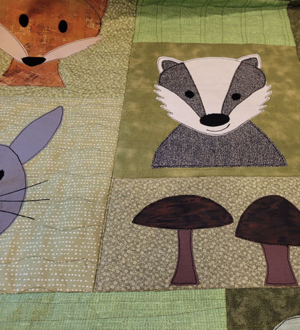 | It was done using Quilt as you Go methods. | The pattern is called Woodland Critters by Shiny Happy World. |